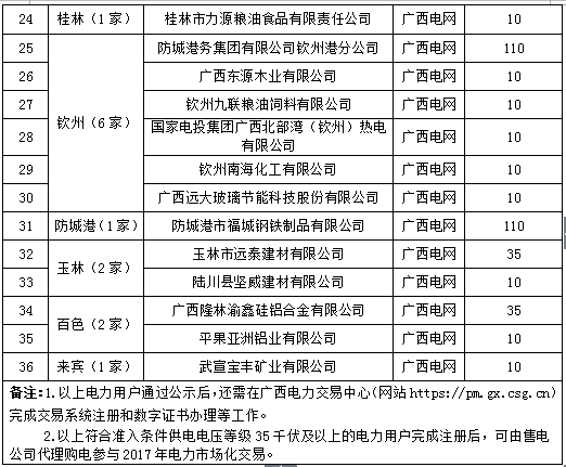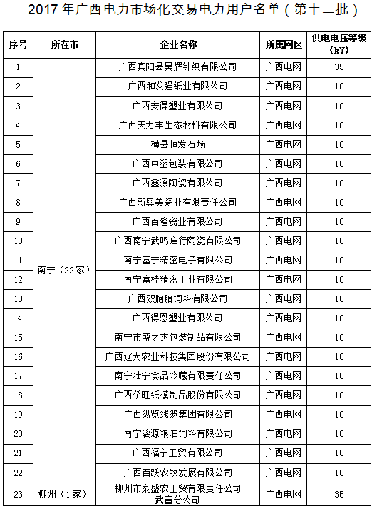 2017年廣西電力市場化交易電力用戶準入名單(第十二批)的公示