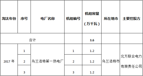 按照國(guó)家能源局《關(guān)于下達(dá)2017年煤電行業(yè)淘汰落后產(chǎn)能目標(biāo)任務(wù)(第一批)的通知》(國(guó)能發(fā)電力[2017]45號(hào))下達(dá)的目標(biāo)任務(wù)和要求,現(xiàn)將內(nèi)蒙古自治區(qū)2017年電力行業(yè)淘汰落后產(chǎn)能烏蘭浩特第一熱電廠(3臺(tái)1.2萬(wàn)千瓦機(jī)組)關(guān)停情況予以公告。請(qǐng)社會(huì)各界予以監(jiān)督。