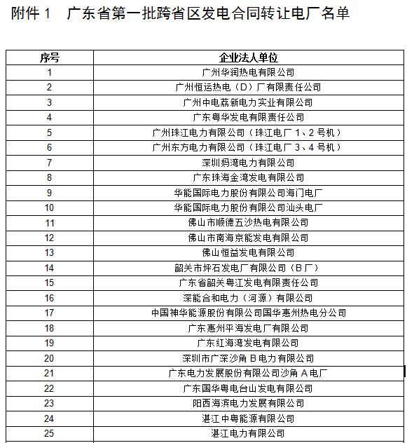 附件:1. 廣東省第一批跨省區(qū)發(fā)電合同轉讓電廠名單(另附)