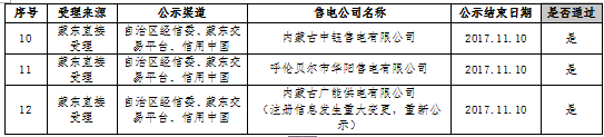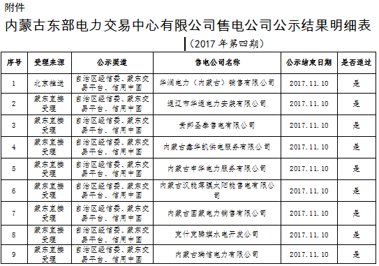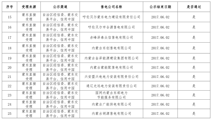 內蒙古東部電力交易中心日前發(fā)布了2017年第三期、第四期售電公司公示結果明細表,此次共有來自北京推送和蒙東直接受理兩種來源,兩批次共有37家售電公司在名單內。詳情如下: