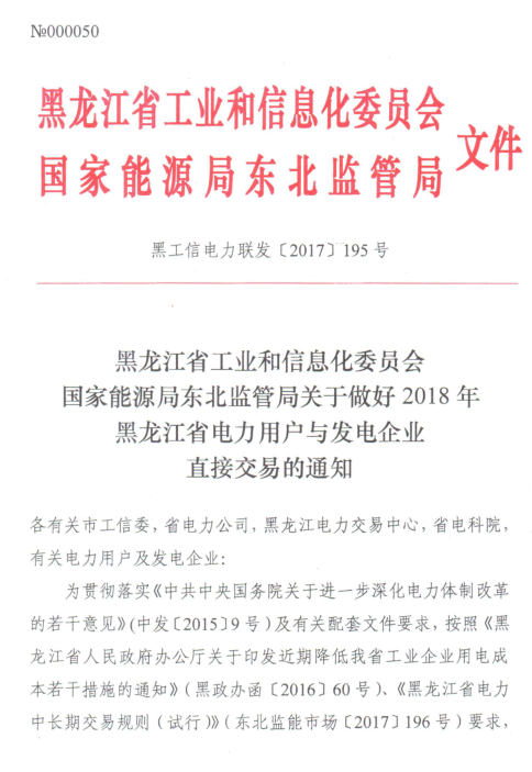 黑龍江工信委、國家能源局東北監(jiān)管局日前聯(lián)合發(fā)布了《關(guān)于做好2018年黑龍江省電力用戶與發(fā)電企業(yè)直接交易的通知》,通知中稱,2018年電力用戶與發(fā)電企業(yè)直接交易規(guī)模為120億千瓦時。參加2018年直接交易的用電企業(yè)