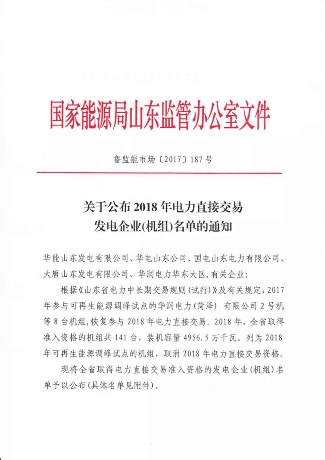 山東2018年電力直接交易發(fā)電企業(yè)(機組)名單