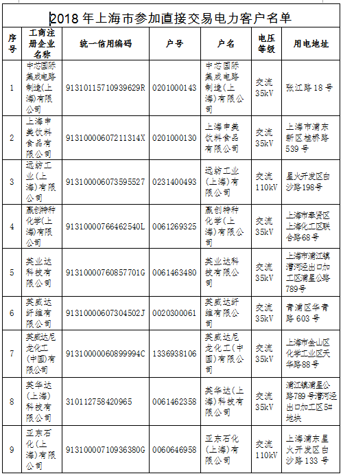 上海2018年直接交易準(zhǔn)入電力用戶名單