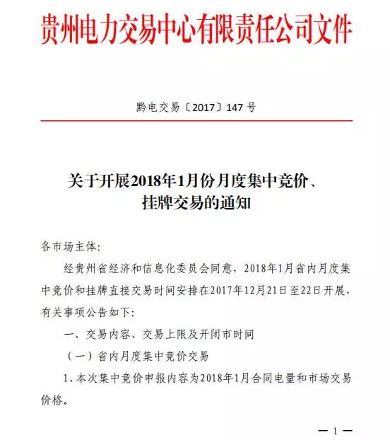 貴州2018年1月月度集中競(jìng)價(jià)、掛牌交易于21、22日展開(kāi)