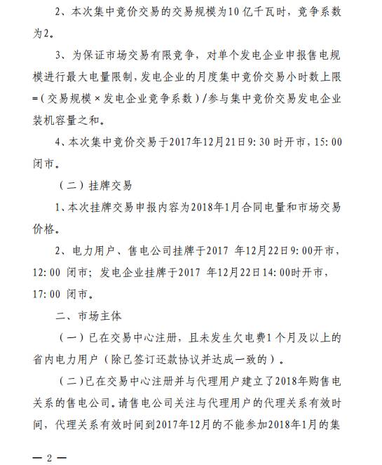 掛牌交易申報(bào)內(nèi)容為2018年1月合同電量和市場(chǎng)交易價(jià)格。電力用戶、售電公司掛牌于2017年12月22日9:00開(kāi)市,12:00閉市;發(fā)電企業(yè)掛牌于2017年12月22日14:00時(shí)開(kāi)市,17:00閉市。