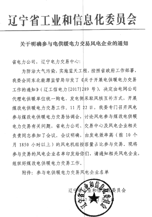 依據(jù)《遼寧省工業(yè)和信息化委員會、國家能源局東北監(jiān)管局關(guān)于開展電供暖電力交易工作的通知》(遼工信電力[2017]289號)(附件1)、遼寧省工業(yè)和信息化委員會《關(guān)于明確參與電供暖電力交易風(fēng)電企業(yè)的通知》(附件2)等相關(guān)文件要求,遼寧電力交易中心有限公司將通過電力交易平臺組織遼寧省電供暖電力交易工作,具體安排通知如下: