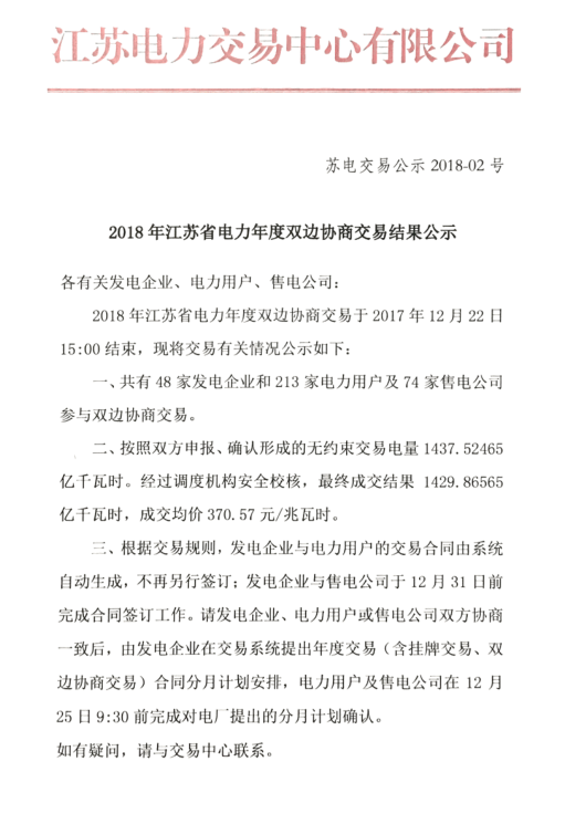 2018年江蘇省電力年度雙邊協(xié)商交易于2017年12月22日15:00結(jié)束。共有48家發(fā)電企業(yè)和213家電力用戶及74家售電公司參與雙邊協(xié)商交易。