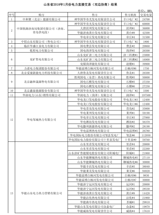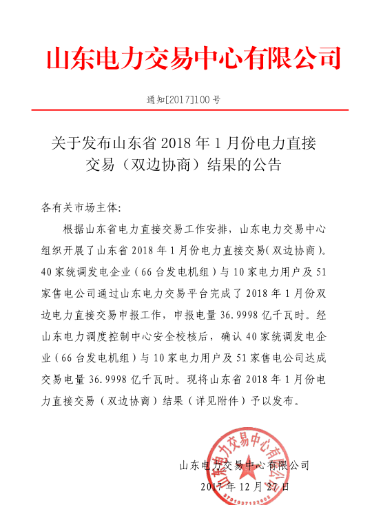 山東電力交易中心發(fā)布《2018年1月份電力直接交易(雙邊協(xié)商)結(jié)果的公告》