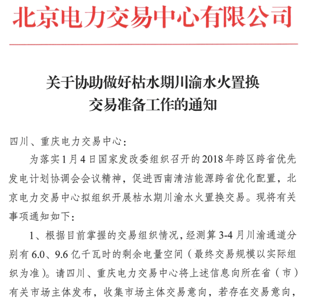 四川電力交易中心發(fā)布《關(guān)于協(xié)助做好枯水期川渝水火置換交易準備工作的通知》,文中指出,為落實1月4日國家發(fā)改委組織召開的2018年跨區(qū)跨省優(yōu)先發(fā)電計劃協(xié)調(diào)會會議精神,促進西南清潔能源跨省優(yōu)化配置,北京電力交易中心擬組織開展枯水期川渝水火置換交易。