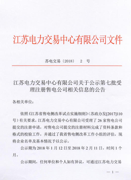 江蘇電力交易中心日前發(fā)布了《關(guān)于公示第七批受理注冊(cè)售電公司相關(guān)信息》的公告,公告中稱,江蘇電力交易中心受理了26家售電公司提交的注冊(cè)申請(qǐng),公示期為2018年1月12日至2018年2月11日,時(shí)間1個(gè)月。詳情如下: