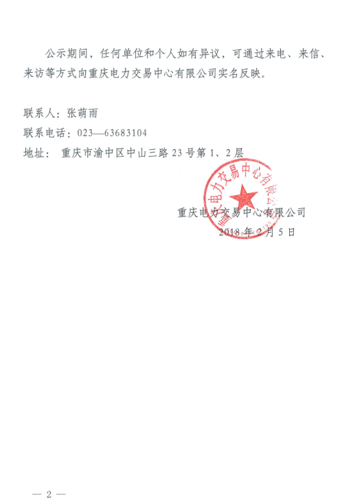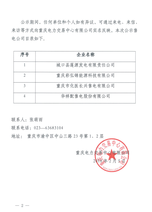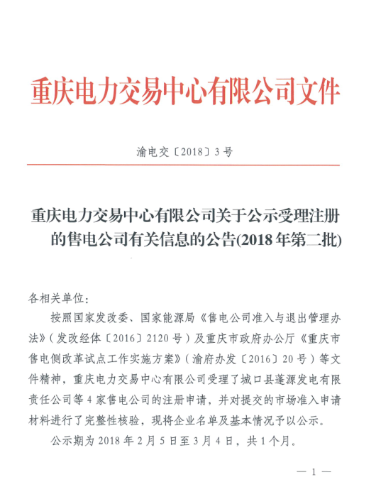 重慶電力交易中心日前發(fā)布了《關于公示受理注冊售電公司相關信息的公告(2018年第二批)》,受理了城口縣蓬源發(fā)電有限責任公司等4家售電公司的注冊申請,公示期為2018年2月5日至3月4日,共1個月。