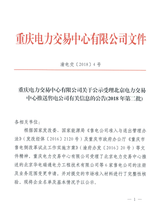 重慶電力交易中心日前發(fā)布了《關于公示受理注冊售電公司相關信息的公告(2018年第二批)》,受理了城口縣蓬源發(fā)電有限責任公司等4家售電公