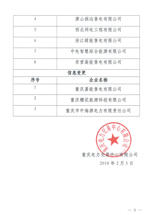 重慶電力交易中心日前發(fā)布了《關于售電公司公示結果的公告(2018年第一批)》,重慶電力交易中心于2018年1月4日至2月3日對重慶千信能源環(huán)保有限公司等6家售電公司、國投甘肅售電有限公司等8家北京電力交易中心推送售電公司注冊申請材料及業(yè)務范圍變更申請材料、重慶嘉能售電有限公司等3家企業(yè)信息變更申請材料進行了公示,未收到異議。