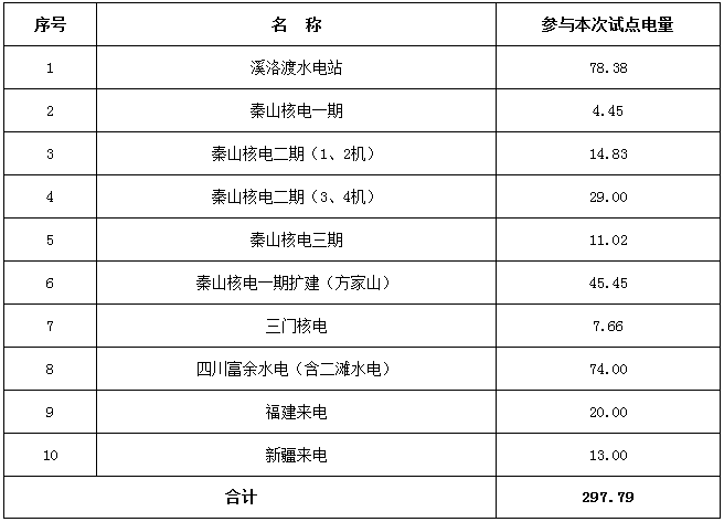 一、發(fā)電企業(yè)可直接交易電量:享有優(yōu)先發(fā)電權的發(fā)電企業(yè),參與本次試點電量(省內(nèi)發(fā)電企業(yè)為上網(wǎng)電量,省外發(fā)電企業(yè)為送浙江省落地電量,下同)計297.79億千瓦時,其他發(fā)電企業(yè)參與本次試點電量限值計1435.11億千瓦時。