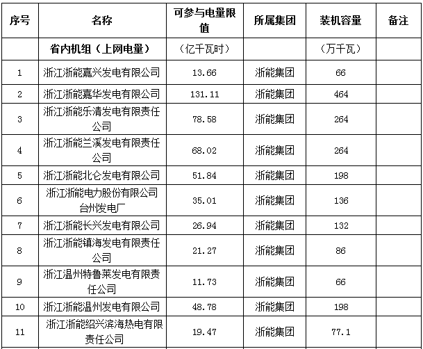享有優(yōu)先發(fā)電權的發(fā)電企業(yè),參與本次試點電量(省內(nèi)發(fā)電企業(yè)為上網(wǎng)電量,省外發(fā)電企業(yè)為送我省落地電量,下同)計297.79億千瓦時,具體名單和參與試點電量詳見附件1。其他發(fā)電企業(yè)參與本次試點電量限值計1435.11億千瓦時,具體名單和可直接交易電量限值詳見附件2。各發(fā)電集團燃煤電廠(不含未正式明確送我省電量的機組),參與本次試點電量限值及裝機容量詳見附件3。