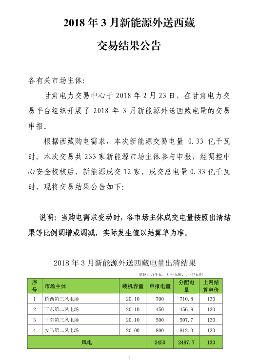 3月甘肅火電企業(yè)、新能源外送西藏、外送青海交易結(jié)果公告
