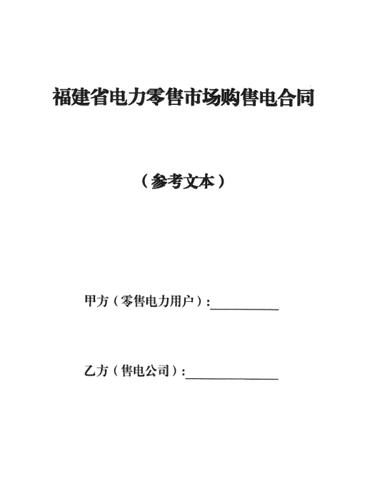 國(guó)家能源局福建監(jiān)管辦日前發(fā)布了《福建省電力市場(chǎng)交易相關(guān)合同示范文本的通知》,其中包含《福建省電力直接交易三方合同》(示范文本)、《福建省電力零售市場(chǎng)供電合同》(示范文本)、《福建省電力零售市場(chǎng)購(gòu)售電合同》(參考文本)。