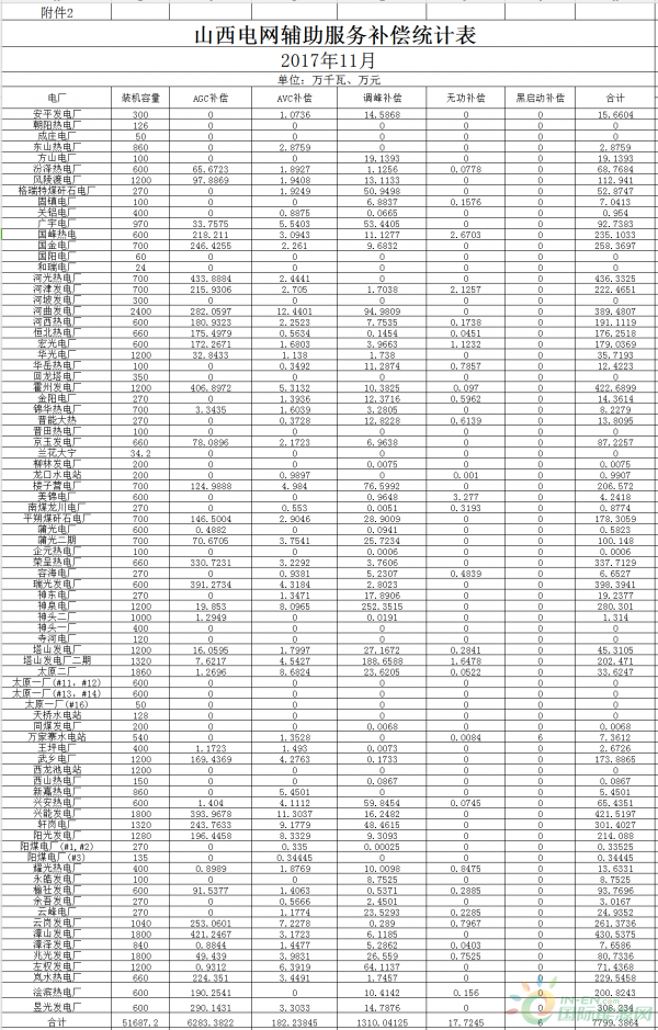 山西發(fā)改委:11月份山西電網(wǎng)輔助服務(wù)補償統(tǒng)計表
