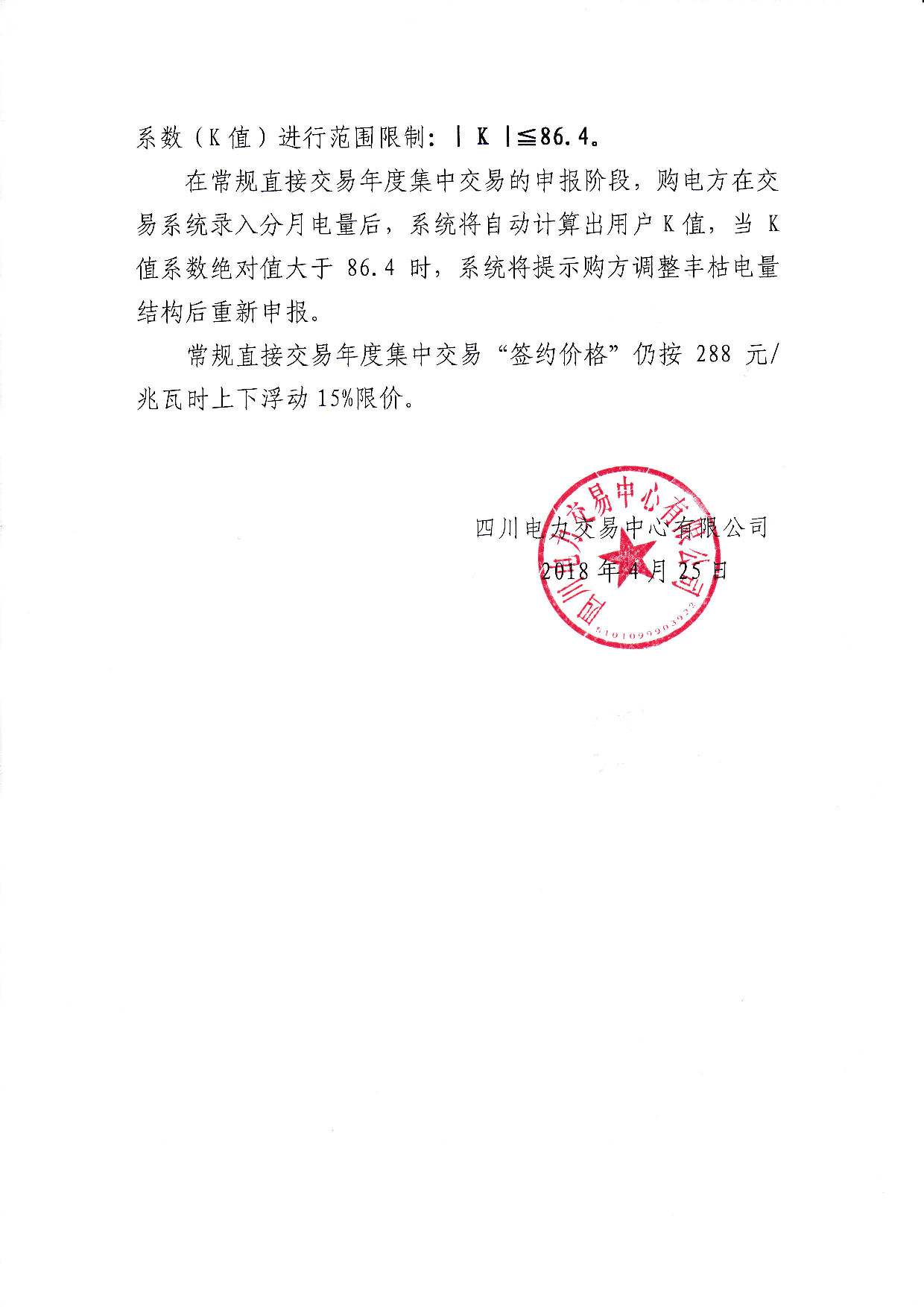 四川電力交易中心日前發(fā)布了《關于常規(guī)直接交易年度集中交易豐枯結構折價系數(shù)(K值)限值的通知》,為完善集中交易規(guī)則,維護交易秩序,經(jīng)請示四川省經(jīng)濟和信息化委、國家能源局四川監(jiān)管辦,現(xiàn)對常規(guī)直接交易年度集中交易中的用戶申報各月電量構成的豐枯結構折價系數(shù)(K值)進行范圍限制:| K |≦86.4。