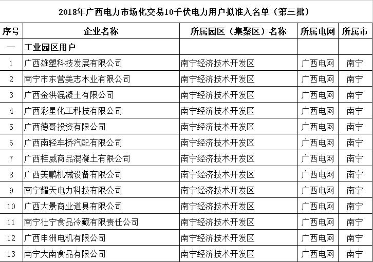 2018年廣西電力市場(chǎng)化交易10千伏電力用戶準(zhǔn)入名單(第三批)的公示