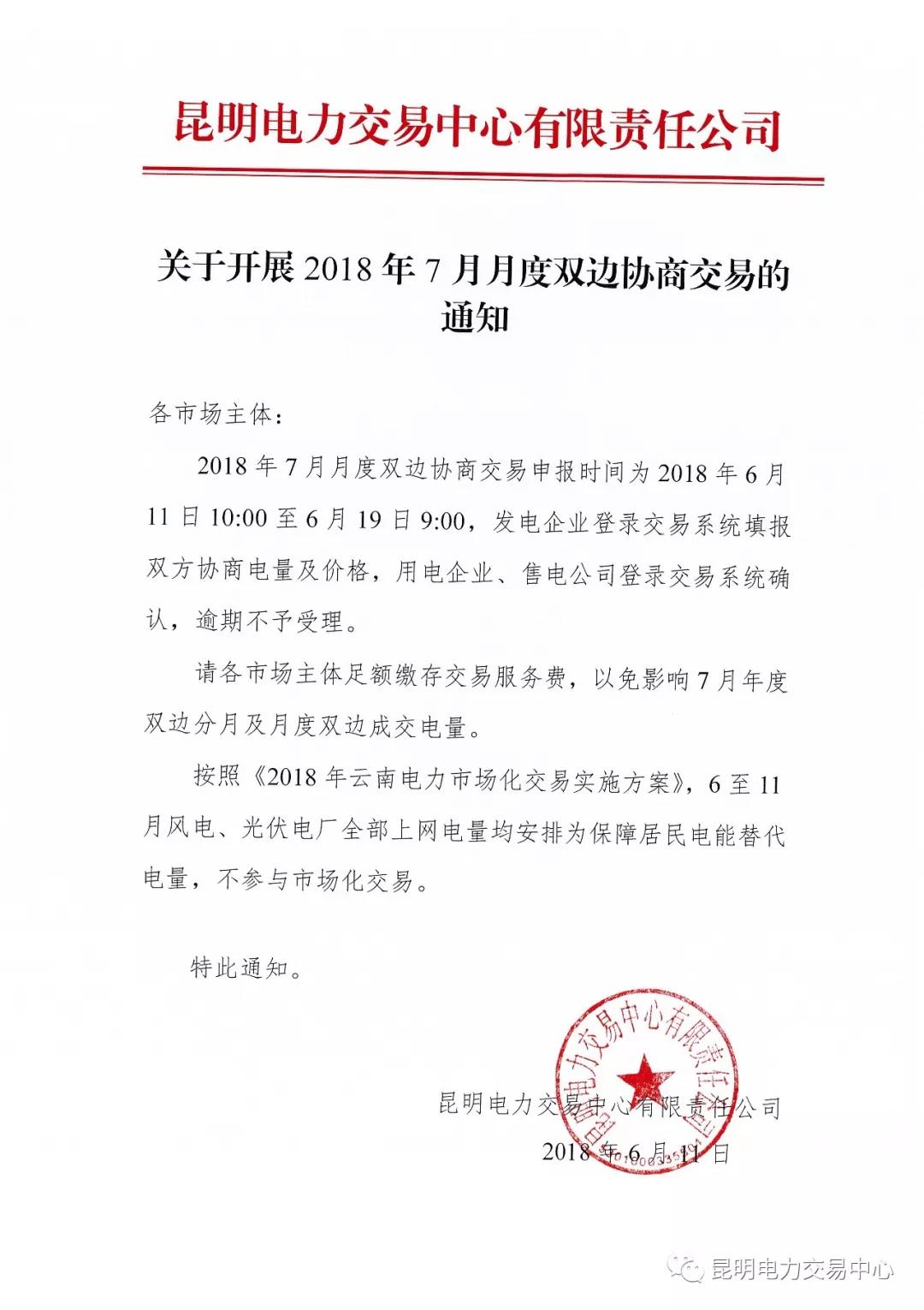 關(guān)于開展2018年7月月度雙邊協(xié)商交易的通知