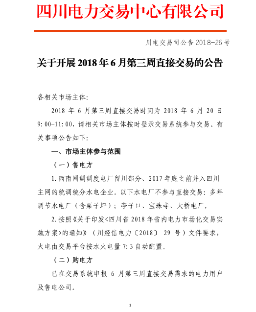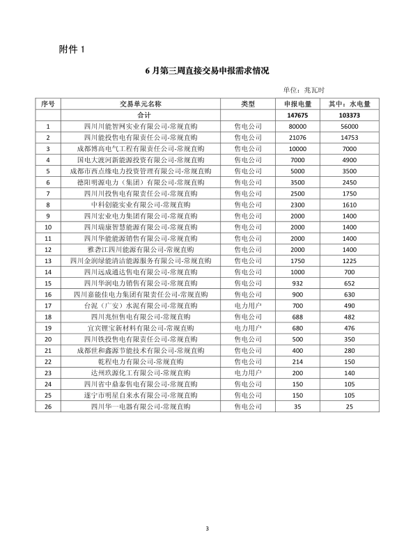 四川開展2018年6月第三周直接交易 申報電量總需求1.48億千瓦時(附名單)