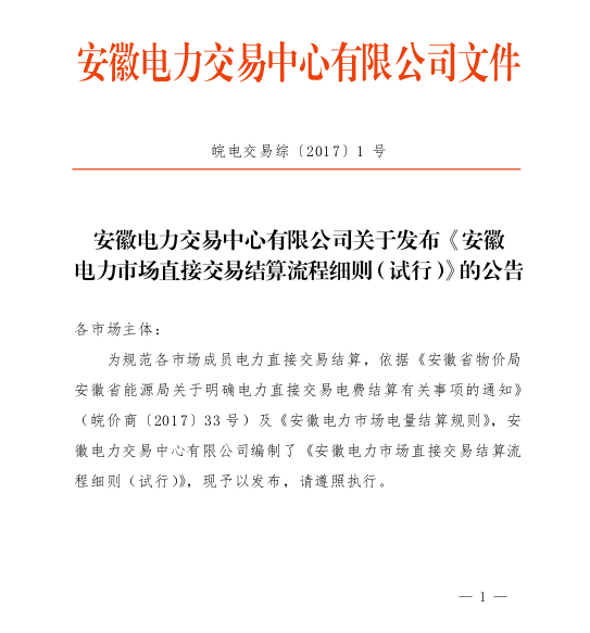 附件:安徽電力交易中心有限公司關(guān)于發(fā)布《安徽電力市場直接交易結(jié)算流程細則(試行)的公告 皖電交易綜〔2017〕1號