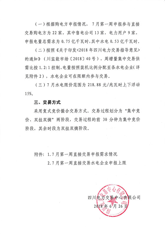 四川2018年7月第一周直接交易 電量總需求0.75億千瓦時
