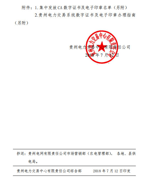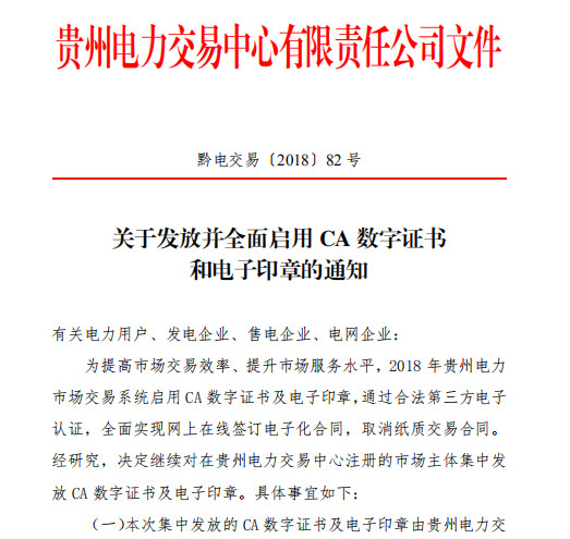 貴州電力交易中心今日發(fā)布了《關(guān)于發(fā)放并全面啟用CA數(shù)字證書(shū)和電子印章的通知》,決定繼續(xù)對(duì)在貴州電力交易中心注冊(cè)的電力用戶、發(fā)電企業(yè)、