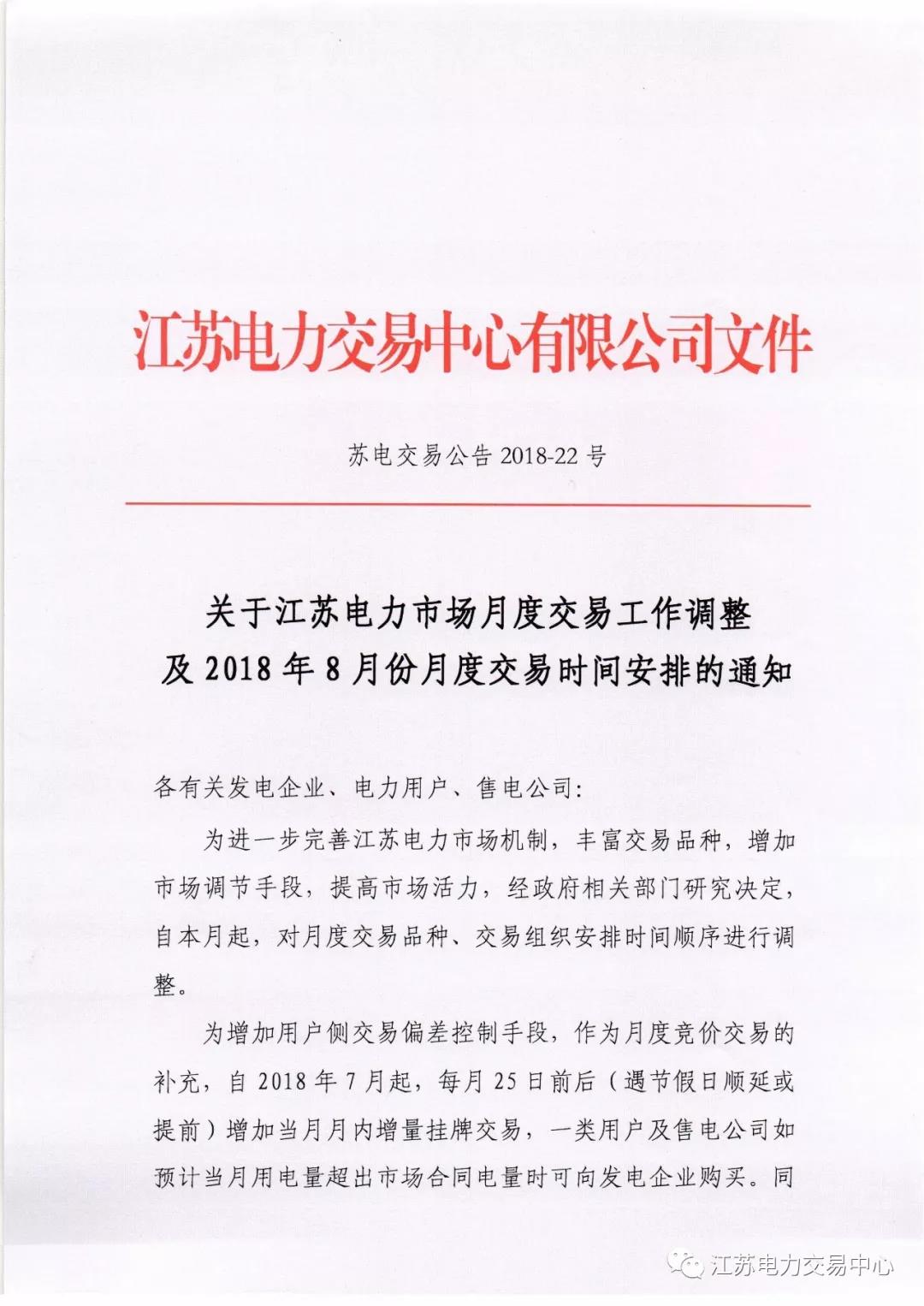 關(guān)于江蘇電力市場月度交易工作調(diào)整及2018年8月份月度交易時間安排的通知