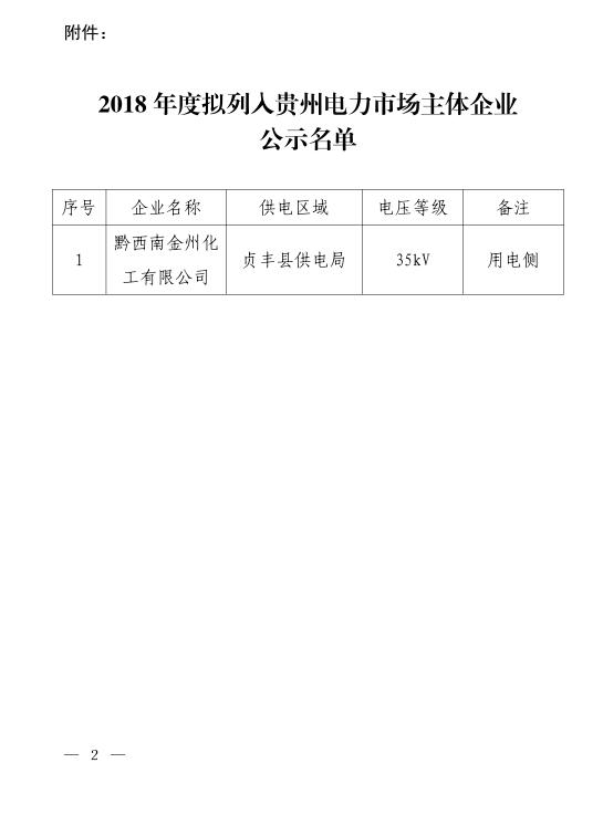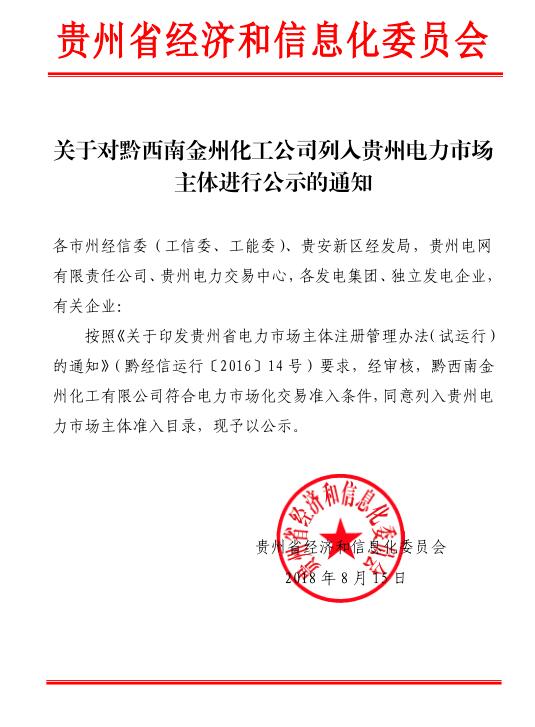 貴州省經(jīng)信委今日發(fā)布了《關(guān)于對(duì)黔西南金州化工公司列入貴州電力市場(chǎng)主體進(jìn)行公示的通知》,公示黔西南金州化工公司1家電力用戶。詳情如下: