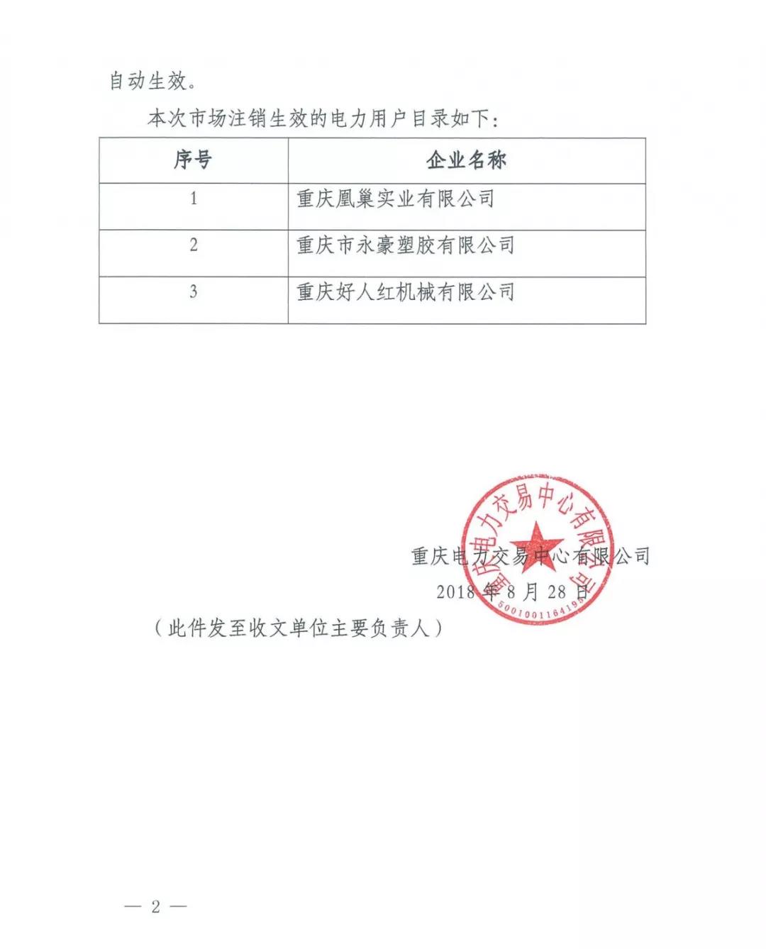 按照國家發(fā)改委、國家能源局《電力中長期交易基本規(guī)則(暫行)》(發(fā)改能源〔2016〕2784號(hào))及《重慶市電力直接交易規(guī)則(試行)》(渝經(jīng)信發(fā)〔2016〕72號(hào))等文件精神,重慶電力交易中心有限公司于2018年8月22日至8月27日對重慶凰巢實(shí)業(yè)有限公司等3家電力用戶市場注銷申請進(jìn)行了公示。