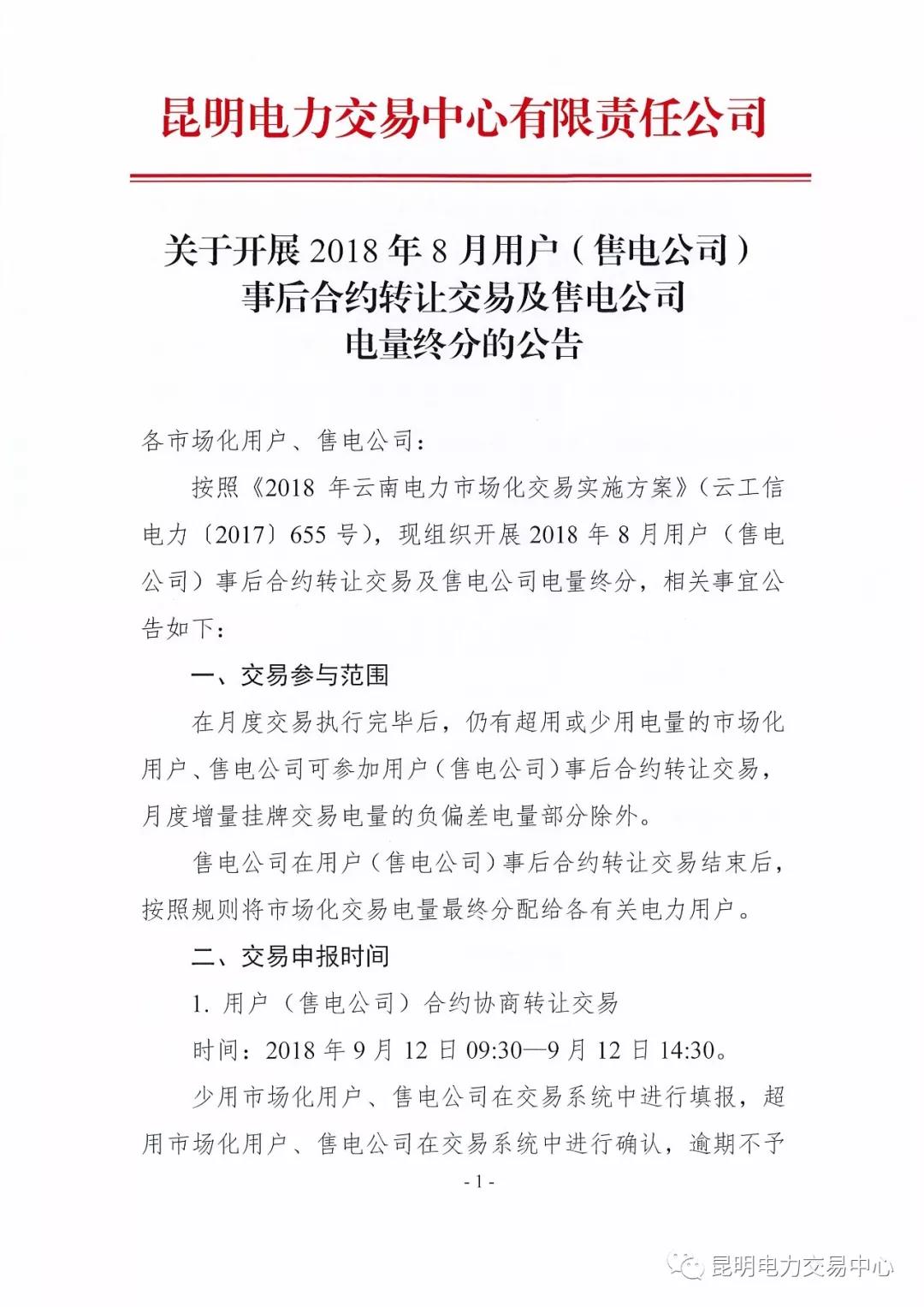 云南關(guān)于開(kāi)展2018年8月用戶(售電公司)事后合約轉(zhuǎn)讓交易及售電公司電量終分的公告