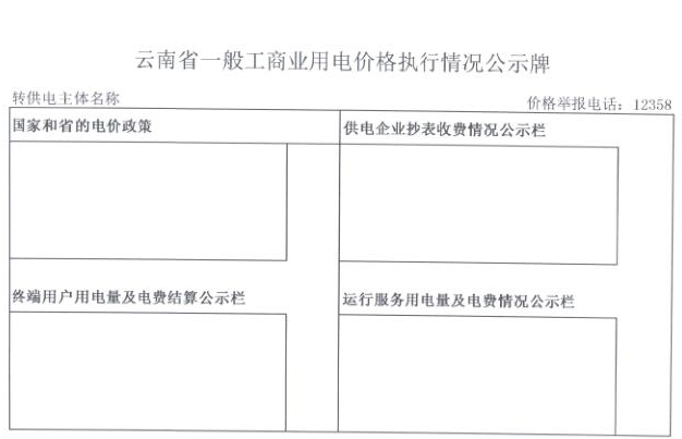要求建立轉(zhuǎn)供電環(huán)節(jié)電價(jià)執(zhí)行情況公示制度,各轉(zhuǎn)供電主體應(yīng)在醒目位置懸掛“云南省一般工商業(yè)用電價(jià)格執(zhí)行情況公示牌”并向終端用戶發(fā)放“用電交費(fèi)明白卡”。
