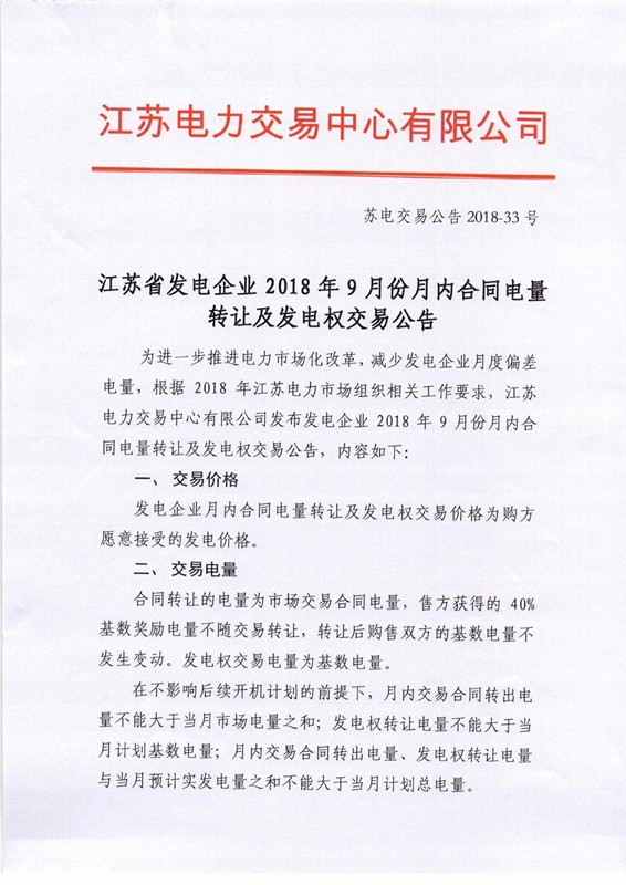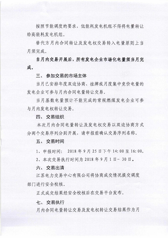 江蘇2018年9月月內(nèi)合同電量轉(zhuǎn)讓及發(fā)電權(quán)交易9月25日展開