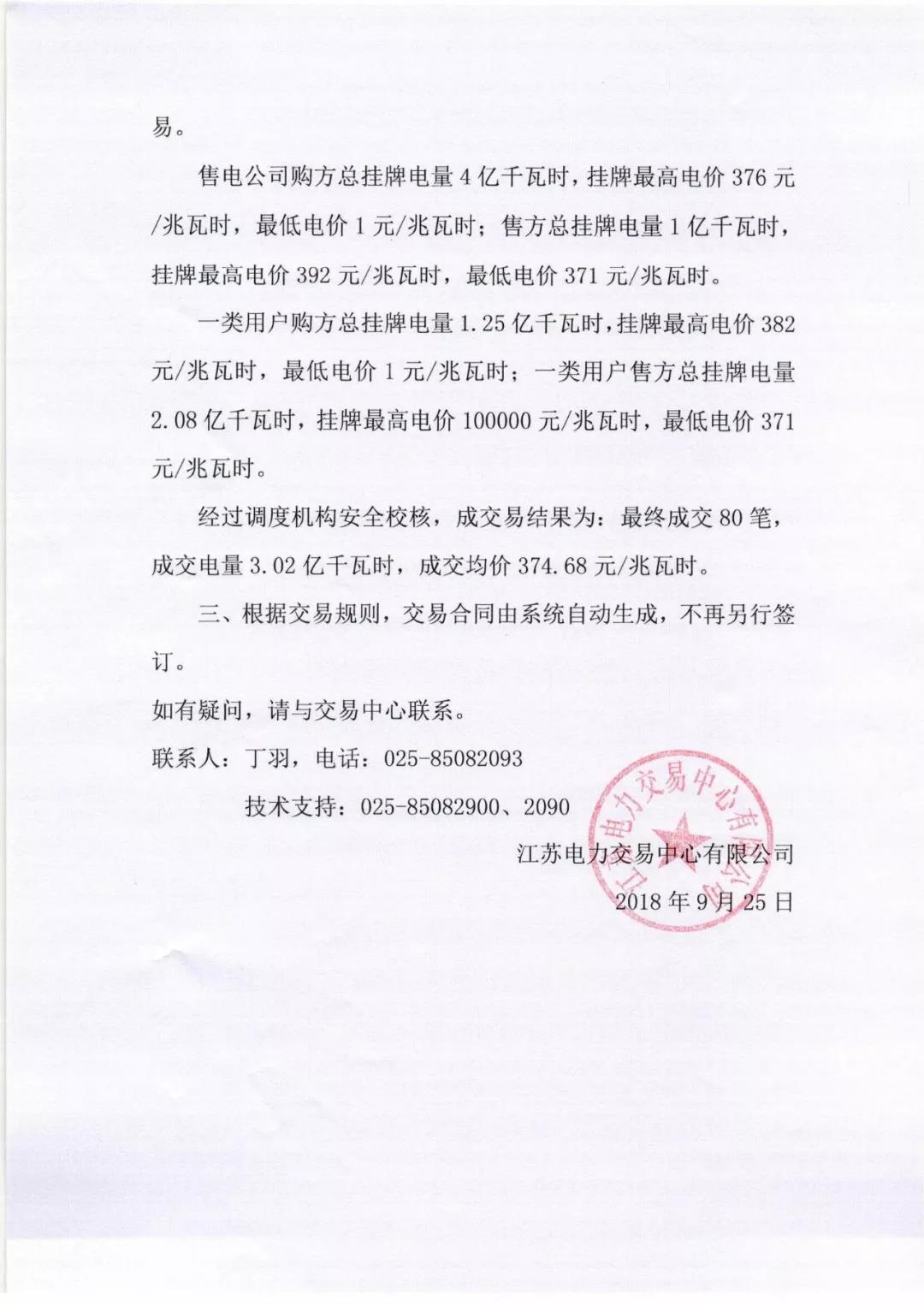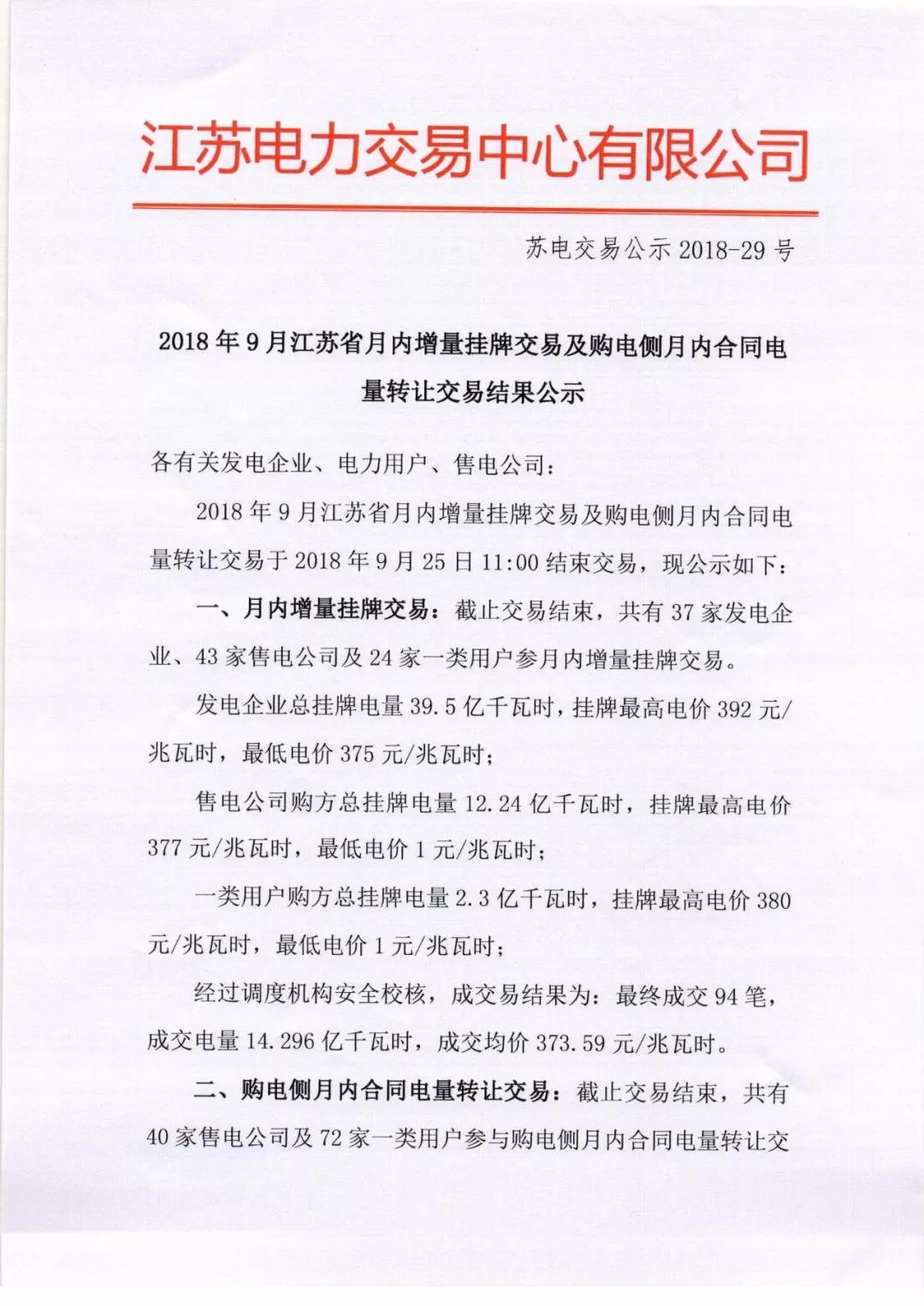 2018年9月江蘇省月內(nèi)增量掛牌及購電側(cè)月內(nèi)合同電量轉(zhuǎn)讓交易結(jié)果公示