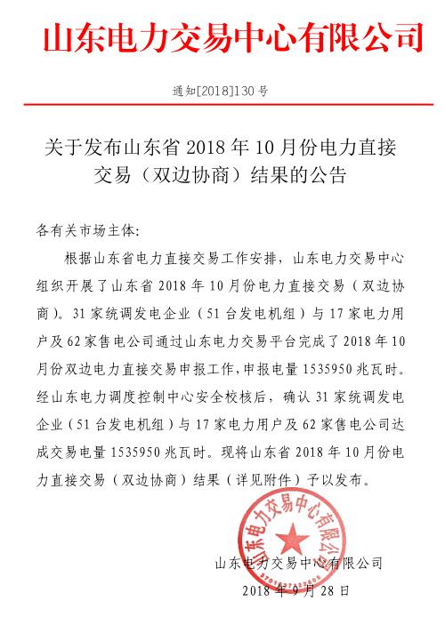 山東2018年10月電力直接交易(雙邊協(xié)商):交易電量153.59萬(wàn)兆瓦時(shí)