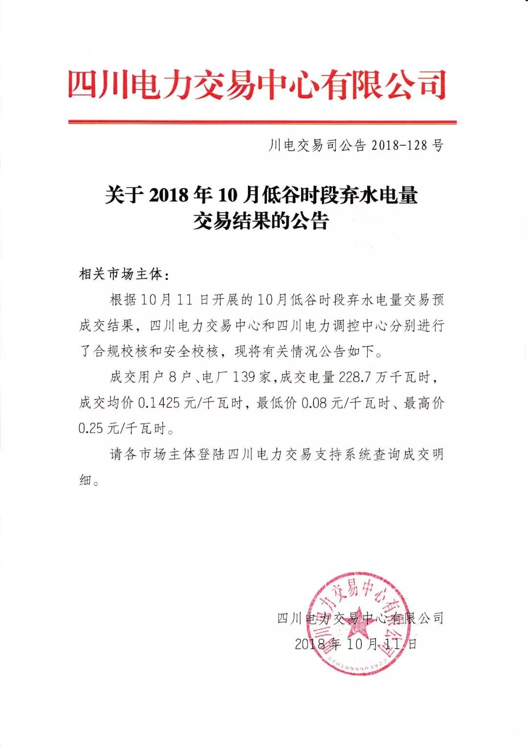 公告 | 四川關(guān)于2018年10月低谷時段棄水電量交易結(jié)果的公告
