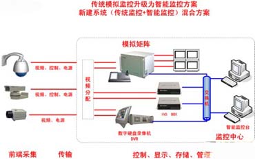 解決方案二:對于傳統(tǒng)模擬監(jiān)控(已建或新建),選擇重點、高危監(jiān)控目標和場所,針對此部分圖像進行分析功能,主動監(jiān)控,將預(yù)警、警情實時發(fā)給模擬矩陣和DVR,完成快速切換和錄像,選擇智能分析硬盤錄像機,解決方案如圖所示: