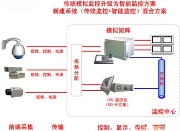解決方案一:對于傳統(tǒng)模擬監(jiān)控(已建或新建),選擇重點、高危監(jiān)控目標和場所,針對此部分圖像進行分析功能,主動監(jiān)控,將預(yù)警、警情實時發(fā)給模擬矩陣和DVR,完成快速切換和錄像,選擇智能視頻服務(wù)器(IVS BOX),解決方案如圖所示: