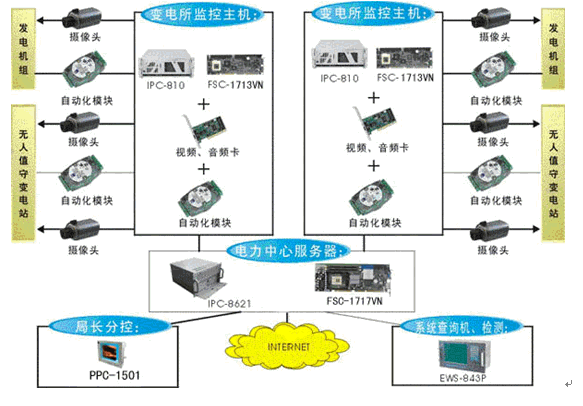 采集單元,從而在遠(yuǎn)端能對(duì)各監(jiān)控所的相關(guān)數(shù)據(jù)、圖像進(jìn)行采集和對(duì)站內(nèi)電壓、電流、功率等信號(hào)進(jìn)行監(jiān)控和監(jiān)視。以便能夠?qū)崟r(shí)、準(zhǔn)確、直接了解和掌握各變電站、變電所的情況,并及時(shí)做出反應(yīng)。由于系統(tǒng)的開發(fā)商是國(guó)內(nèi)著名的解決電力行業(yè)監(jiān)控的專業(yè)集成商,并采用研祥公司的工控機(jī)代替普通PC機(jī)后,系統(tǒng)的抗干擾性、穩(wěn)定性、不間斷性得到大大的提高。