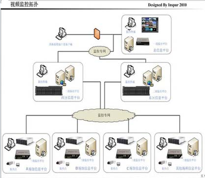 在充分了解行業(yè)客戶需求基礎(chǔ)上,順應(yīng)安防監(jiān)控的發(fā)展特點(diǎn)和發(fā)展趨勢(shì),浪潮存儲(chǔ)專門針對(duì)安防監(jiān)控行業(yè)制定了一套解決方案。展覽館作為人群和物資密集型的場(chǎng)所,對(duì)監(jiān)控防范環(huán)節(jié)提出了較高的要求,下面就以典型的展覽館監(jiān)控布署為例,浪潮在方案設(shè)計(jì)中將整個(gè)展覽館的監(jiān)控體系分為三級(jí)體系,展覽館為第一級(jí)信息監(jiān)控平臺(tái),2個(gè)展區(qū)(西區(qū)和東區(qū))作為第二級(jí)信息監(jiān)控平臺(tái),旗下各個(gè)場(chǎng)館(A館、B館和C館)及其他場(chǎng)所作為第三級(jí)信息監(jiān)控平臺(tái)。整個(gè)視頻數(shù)據(jù)的存儲(chǔ)采用分布式集中存儲(chǔ)的方式,前端由負(fù)責(zé)視頻采集,視頻數(shù)據(jù)的上傳等,采集后的視頻經(jīng)過(guò)監(jiān)控專網(wǎng)傳輸?shù)蕉?jí)信息監(jiān)控中心,并進(jìn)行集中存儲(chǔ),總信息平臺(tái)進(jìn)行集中控制和管理。