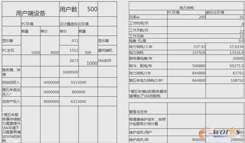 第三個(gè)優(yōu)勢(shì)是節(jié)省成本,促進(jìn)節(jié)能減排。如果我們有500個(gè)用戶,像政府一邊都是雙網(wǎng)隔離的,買(mǎi)PC機(jī)要買(mǎi)一千臺(tái),按4000算的話,總資產(chǎn)投入這邊是800萬(wàn)。如果是用瘦客戶機(jī)的話,整的投入可能是600萬(wàn)。在電力消耗前面說(shuō)過(guò),普通的PC可能是至少200瓦以上,瘦客戶端,我們就算16瓦的話,最后算下來(lái),我們第五年的話,PC的耗電是844,用虛擬環(huán)境的話才是108。再一個(gè),我們的維護(hù)成本,如果說(shuō)是PC環(huán)境的話是800,在虛擬環(huán)境的話就是200,相差四倍的差距。最后算下來(lái),我們可以看一下,這個(gè)數(shù)在第一年的時(shí)候,因?yàn)槲覀円?gòu)買(mǎi)新的設(shè)備,它的設(shè)備是要比PC環(huán)境下支出是要多的。隨著年份的增長(zhǎng)我們會(huì)發(fā)現(xiàn),收益是越來(lái)越大的。