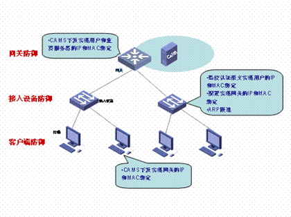 認(rèn)證方式適合網(wǎng)絡(luò)中采用認(rèn)證登陸的場景,通過H3C CAMS服務(wù)器、H3C iNode智能客戶端與接入交換機(jī)和網(wǎng)關(guān)的聯(lián)動,全方面的防御ARP攻擊。