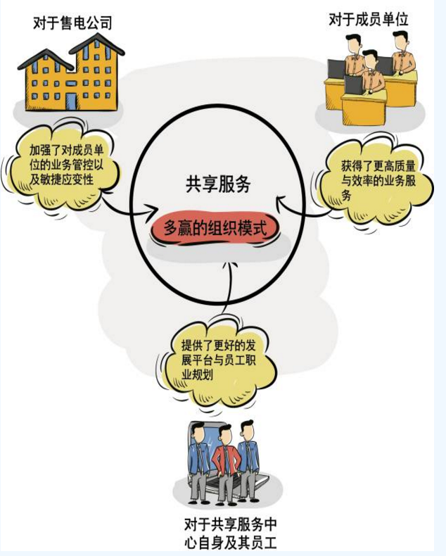 為此,共享服務(wù)是一種多贏的組織模式:對于售電公司,共享服務(wù)加強(qiáng)了對成員單位的業(yè)務(wù)管控以及敏捷應(yīng)變性;對于成員單位而言,共享服務(wù)獲得了更高質(zhì)量與效率的業(yè)務(wù)服務(wù);而對于共享服務(wù)中心自身及其員工而言,則提供了更好的發(fā)展平臺與員工職業(yè)規(guī)劃。是多贏的一種組織模式。