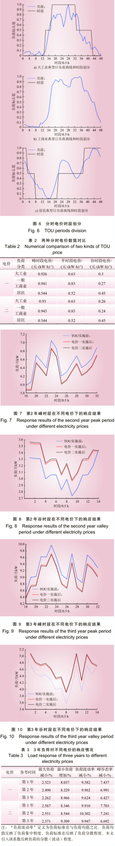 根據(jù)實施 2 種電價后的負(fù)荷特性,可以發(fā)現(xiàn)在實施電價一的情況下,削峰填谷的作用雖然較為明顯,但隨著時間的推移,削峰作用由第 1 年的 2.523% 減小到第 3 年的 2.262%,平緩負(fù)荷波動作用的發(fā)展也不盡如人意。然而在實施電價二的情況下,第 2 年和第 3 年的最大負(fù)荷較實施電價一時的情況均有所降低,到第 3 年的削峰率比實施電價一增加 0.11%,最小負(fù)荷上升,填谷率差距增加至 0.343%,負(fù)荷波動率進(jìn)一步減小,峰谷差率也都有所提高。由此可以得出考慮負(fù)荷發(fā)展的分時電價優(yōu)化模型得到的分時電價對未來的負(fù)荷適應(yīng)性較好,在分時電價實行后的第 2 年與第3 年仍可以對用戶起到持續(xù)性的激勵作用。