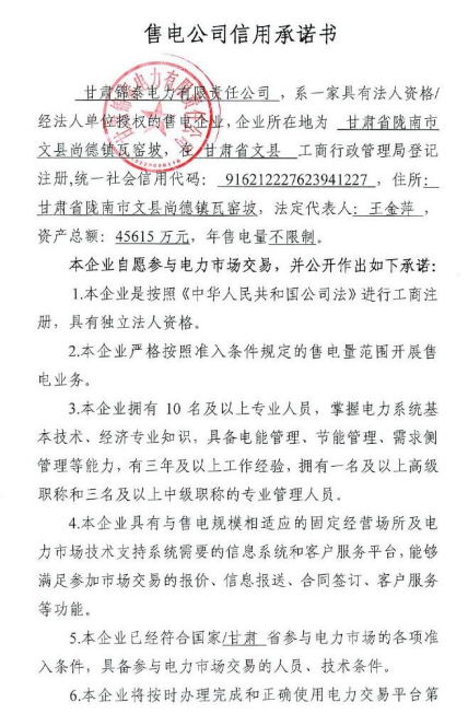 關(guān)于甘肅錦泰電力有限責(zé)任公司注冊(cè)成為電力自主交易市場(chǎng)主體相關(guān)信息的公示