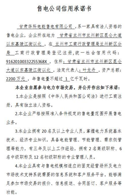 關(guān)于甘肅華科電能售電有限公司注冊成為電力自主交易市場主體相關(guān)信息的公示