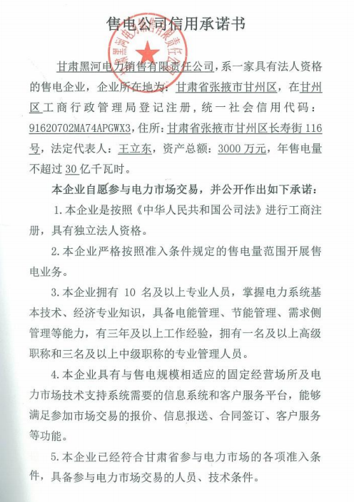關(guān)于甘肅黑河電力銷售有限責(zé)任公司注冊成為電力自主交易市場主體相關(guān)信息的公示
