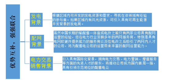 從市場實(shí)際情況來看,企業(yè)更愿意互補(bǔ)多贏、優(yōu)勢整合共同成立配售電公司。據(jù)可靠消息,國網(wǎng)參與配售電也是采取同樣的策略。一方面區(qū)域管委會或投資建設(shè)方面熟悉區(qū)域規(guī)劃和產(chǎn)業(yè)布局,熟悉用戶,并且作為招商引資方也能真心為用戶提供優(yōu)質(zhì)服務(wù),不以追求最大化的利潤為目標(biāo);另一方面社會資本的引入有利于防止配售電公司組織臃腫和低效。但社會資本比例不宜過高,以防過分追求利潤。優(yōu)勢互補(bǔ),強(qiáng)強(qiáng)聯(lián)合使得擁有配電網(wǎng)資源的售電公司營收穩(wěn)定,競爭力更強(qiáng)。